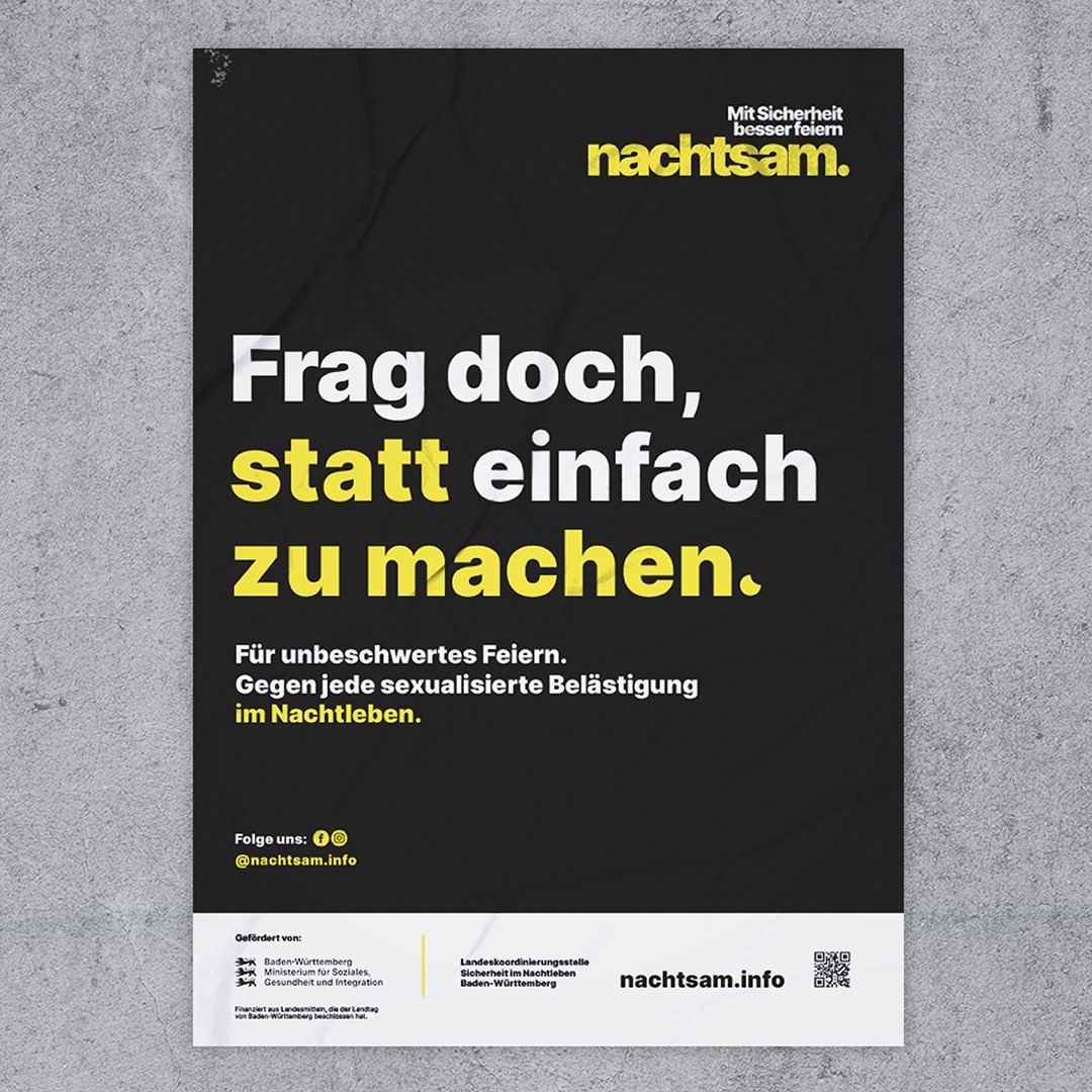 Die neue Kampagne richtet sich an alle Feiernden – mit dem klaren Appell zum Konsens beim Feiern. Durch das Einholen von Einverständnis, bevor, eventuell auch unbeabsichtigt, Grenzen überschritten werden, kann im Nachtleben ein respektvolles und (n)achtsames Miteinander erlebt werden.